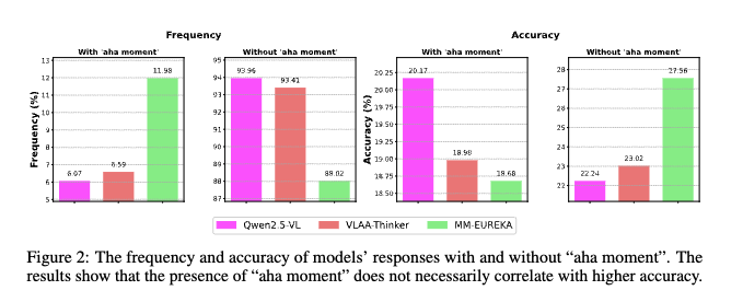하지만 이 논문에서는 (1) MLLM에 RL 훈련을 적용하기 전에도 aha moment 패턴이 존재함, (2) 이러한 패턴이 반드시 추론 성능 향상과 직접적인 관련이 있는 것을 아니라는 점을 지적한다.